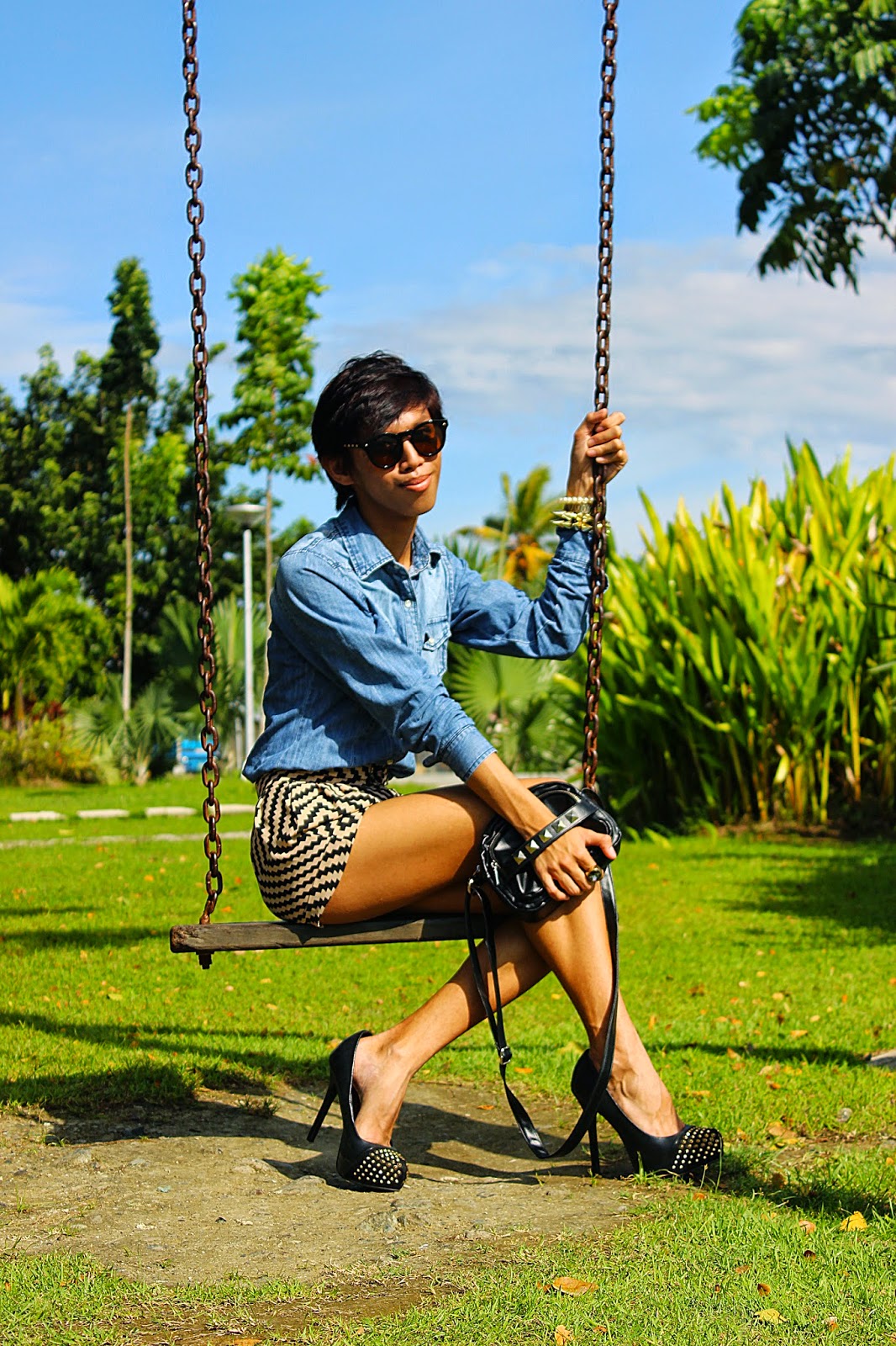 t+bc denim button down | Custom made shorts | Brash for Payless heels | Natasha studded bag | Hawaiian Sun sunnies | Casio watch | SMaccessories ring and pearls bracelet | Aizzy spiked bracelet